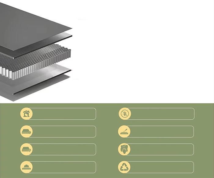 Material: Aluminiumplatte (eloxiert/mit Fluorkohlenstoff besprüht), Aluminiumwabenkern (sechseckige Struktur), Größe des Polyurethan-/Epoxidklebstoffs