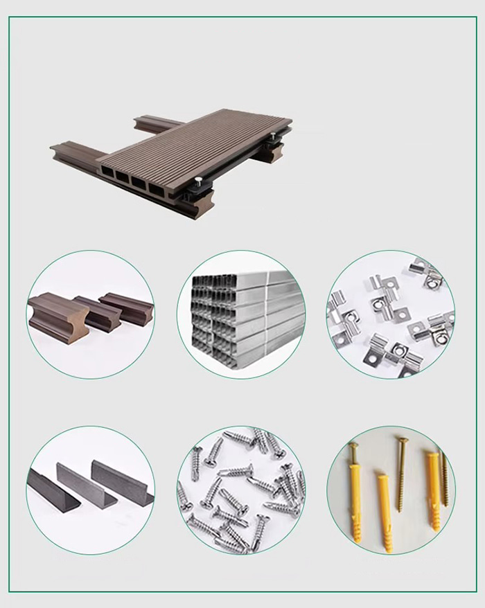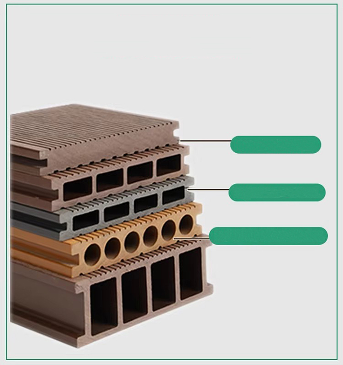 Substratmischung Holzfaser (50–60 %) PVC-Harz (30–40 %) Korrosionsschutzschicht aus Kohlefaser (5–10 %), Zugabe von flammhemmendem Aluminiumhydroxid zur Verbesserung auf Klasse A2.