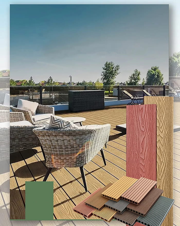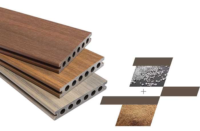 Material: Verbundstoff aus Holzfasern und thermoplastischem Kunststoff (z. B. Polyethylen oder Polyvinylchlorid)