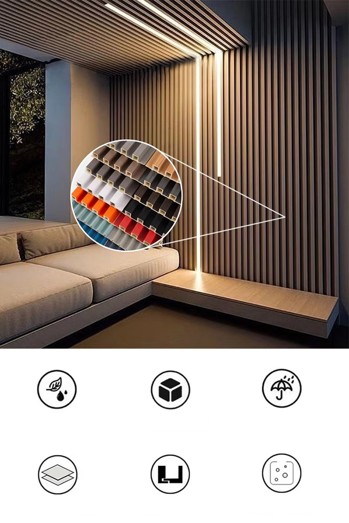 WPC-Innenpaneele sind neue umweltfreundliche Dekorpaneele aus Holzfasern oder Bambusfasern als Kernrohmaterial, die durch ein Hochtemperatur- und Hochdruckverfahren mit PVC-Harz, Calciumcarbonatpulver und Stabilisator vermischt werden. Die Oberfläche verfügt über eine UV-Beschichtung oder hochpräzise Transfertechnologie, um die Textur von Naturholz und Stein zu simulieren, und weist die Eigenschaften wasserdicht und feuchtigkeitsbeständig, schimmelresistent und antibakteriell, leicht und hochfest auf. Es eignet sich für Innenwände, Decken, Hintergrundwände und andere Szenen und ist eine ideale Wahl, um herkömmliche Holzfurniere und Kunststoffzwickel zu ersetzen.