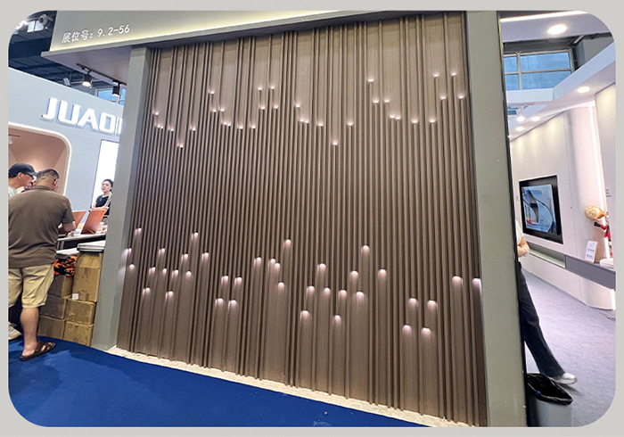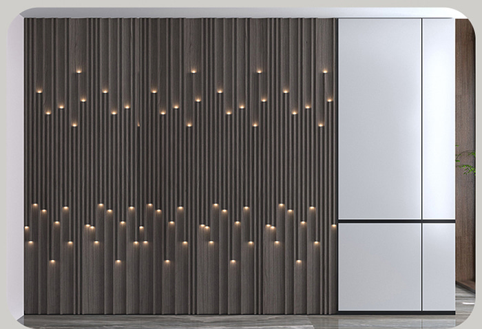Leuchtende Gitterwandpaneele sind ein innovatives Produkt, das moderne Technologie mit dekorativer Ästhetik verbindet. Sie verwenden umweltfreundliche Materialien wie WPC und erzielen leuchtende Effekte durch Rillen oder Einbetten von Lichtwellenleitern in die Oberfläche der Paneele. Diese Art von Wandpaneelen hat nicht nur gute dekorative Eigenschaften, sondern sorgt auch für eine sanfte Beleuchtung, die das Hierarchiegefühl und die Atmosphäre des Raums verstärkt. Seine Oberfläche kann mit verschiedenen Holzmaserungsfarben dekoriert oder mit anderen Materialien kombiniert werden, um unterschiedlichen Designanforderungen gerecht zu werden.