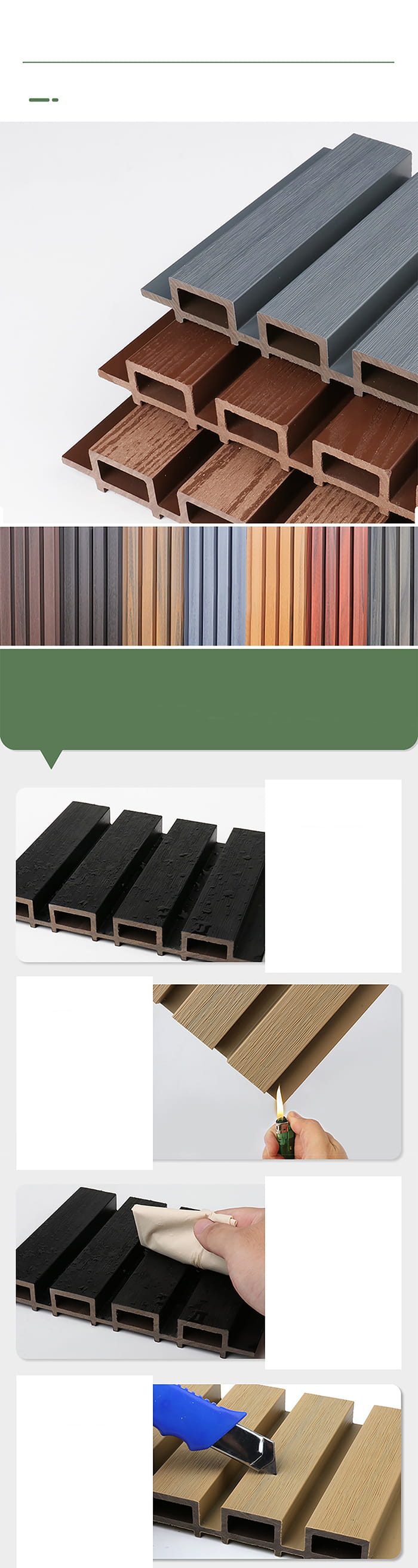 Qualitätsprüfung: Während des Produktionsprozesses werden WPC-Außenpaneele streng auf Qualität geprüft, einschließlich Maßhaltigkeit, Ebenheit, Dichte, Feuerbeständigkeit, Umweltschutzleistung usw.