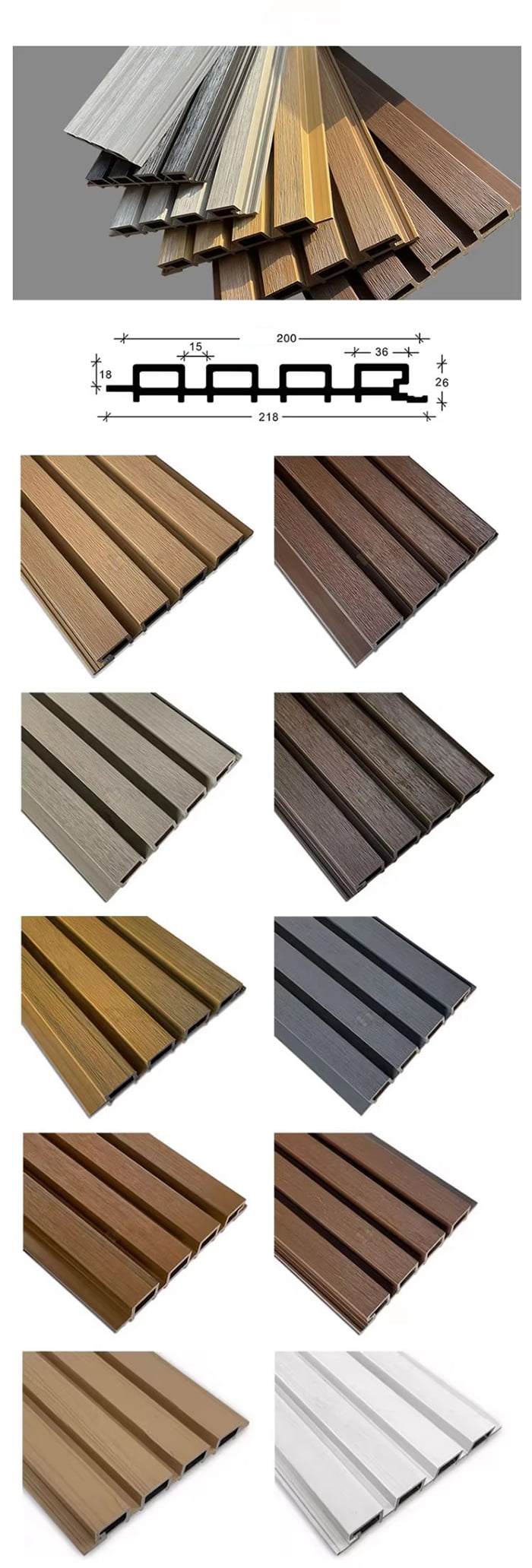 WPC-Außenplatten sind spezielle Außendekorationsplatten aus Holzfasern oder Bambusfasern als Kernrohstoff, die durch ein Hochtemperatur- und Hochdruckverfahren mit PVC-Harz, Kalziumkarbonatpulver und Anti-Ultraviolett-Zusätzen vermischt werden. Die Oberfläche verfügt über eine UV-härtende Beschichtung oder eine hochpräzise Übertragungstechnologie für Holz-/Steinimitationen, die die Textur von Naturholz mit der Witterungsbeständigkeit von Kunststoff kombiniert und die Eigenschaften wasser- und feuchtigkeitsbeständig, schimmelresistent und antibakteriell, anti-ultraviolett, feuerhemmend usw. aufweist. Sie eignet sich für Szenen wie Gartenlandschaften, Außenwanddekorationen, Gartenmöbel usw. und ist eine umweltfreundliche Alternative zu herkömmlichem antiseptischen Holz und Stein.